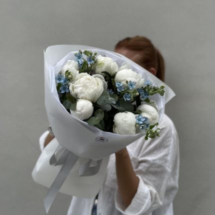 Пион – 5 шт. Твидия – 3 шт. Эвкалипт – 1 шт. Лизиантус – 2 шт.