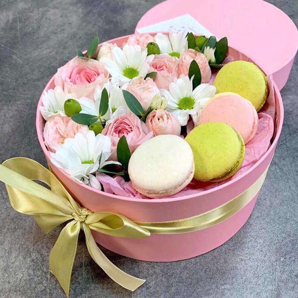 Ромашка – 7 шт.Коробка шляпная – 1 шт.Фисташка пучок – 7 шт.макарон (пирожное) – 4 шт.эустома микс – 5 шт.тишью микс – 1 шт.
