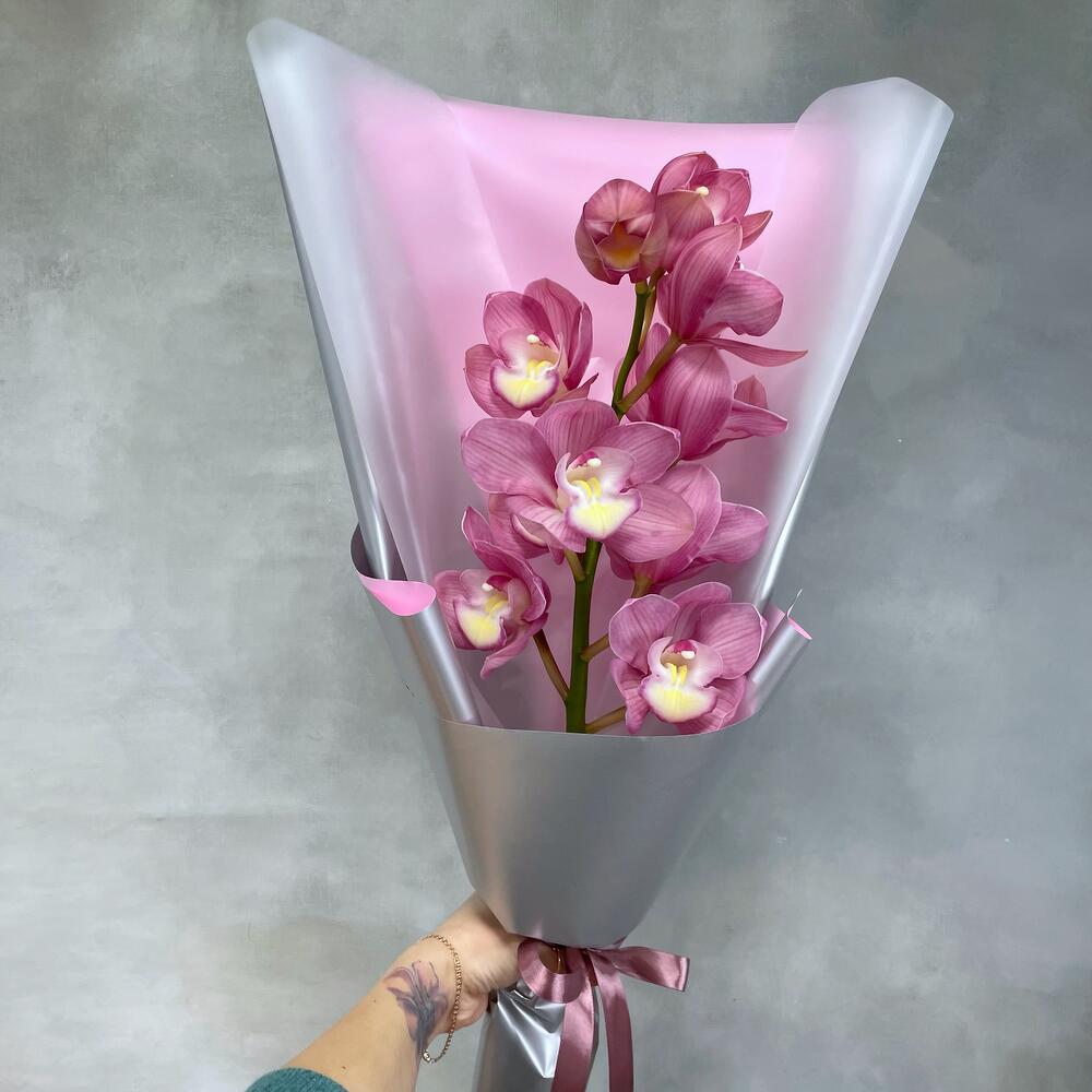 Орхидея ветка – 1 шт.Упаковка пленка матовая – 1 шт.упаковка пленка дизайнерская – 1 шт.Лента атласная – 1 шт.