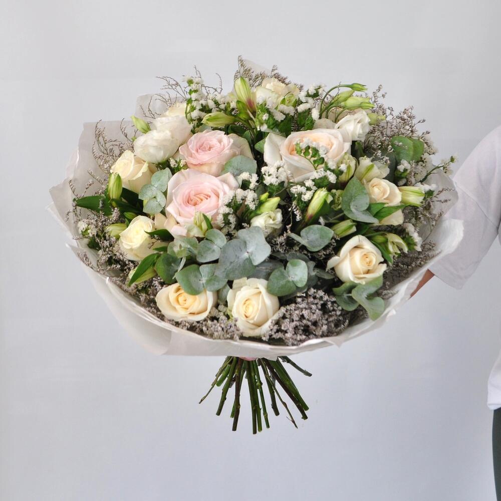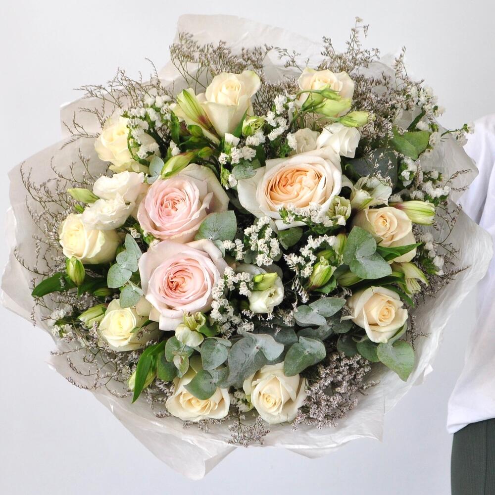 Альстромерия – 5 шт.Лимониум – 2 шт.Статица – 2 шт.Эвкалипт – 2 шт.Роза Эквадор – 8 шт.Эустома – 3 шт.Лента атласная – 1 шт.Роза пионовидная – 3 шт.Упаковка дизайнерская – 6 шт.