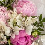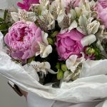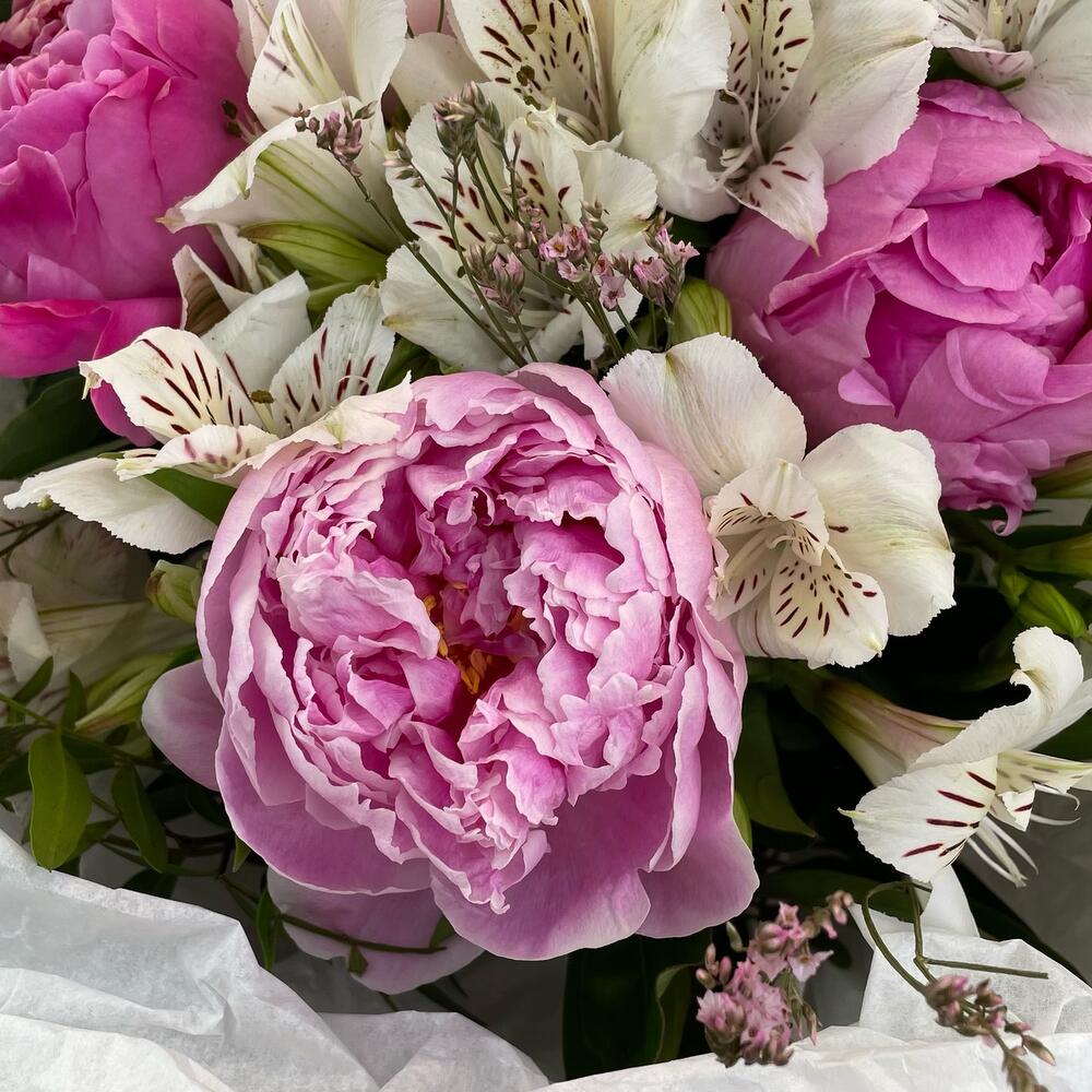 Пион – 5 шт.Альстромерия – 4 шт.Лимониум – 1 шт.Фисташка – 1 шт.Тишью – 3 шт.Упаковка дизайнерская – 1 шт.Лента атласная – 1 шт.