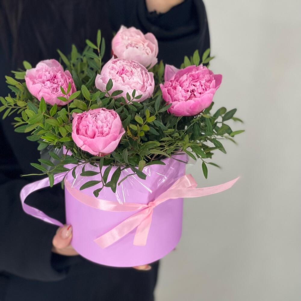 Фисташка – 5 шт.Пион Сара Бернар – 5 шт.коробочка с оазисом и лентами – 1 шт.