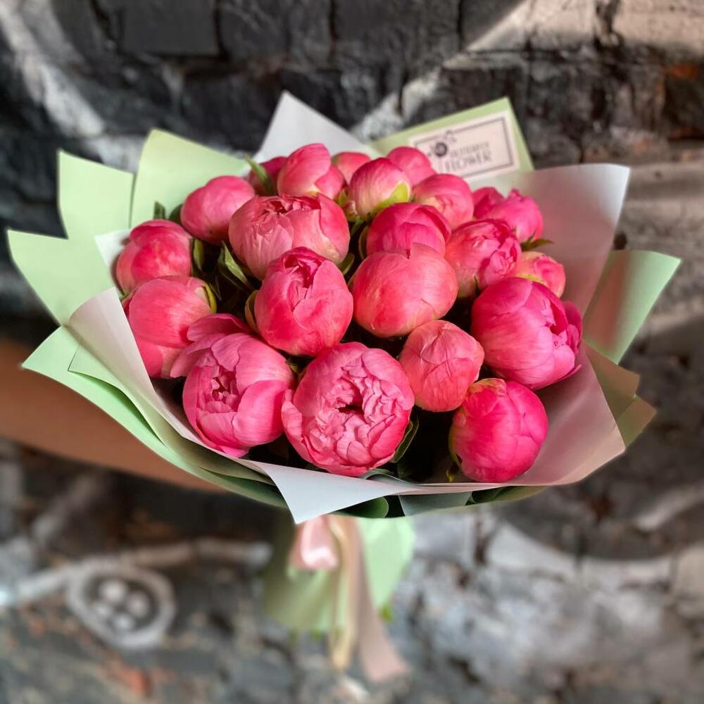 Букет из 21 кораллового пиона в дизайнерской упаковке "Коралл Саншайн"