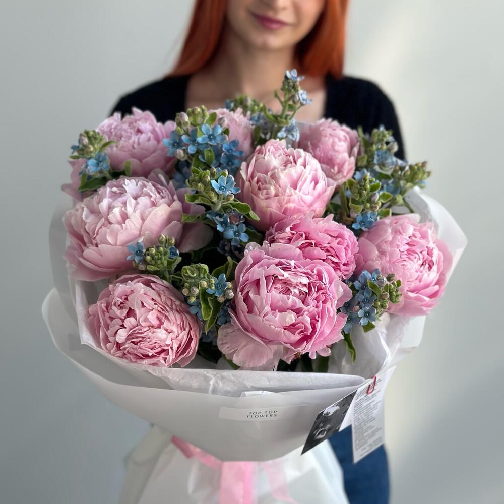 Пион – 9 шт.Оксипеталум – 10 шт.Упаковка дизайнерская – 1 шт.Средство для продления жизни цветов – 1 шт.