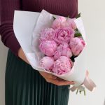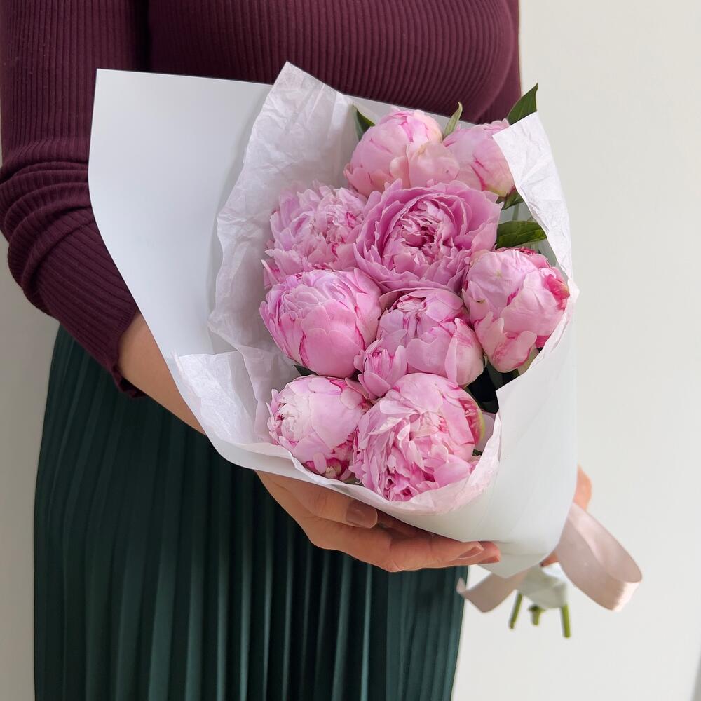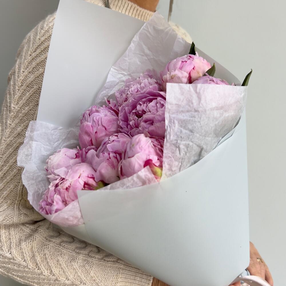Пион – 9 шт.Тишью белое – 2 шт.Пленка дизайнерская – 2 шт.