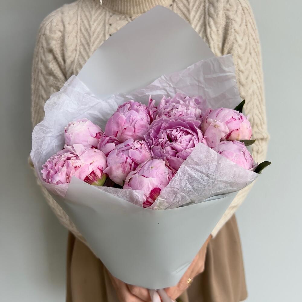 Букет из 9 розовых пионов в упаковке, сорт Сара Бернар , Голландия. Нестареющий шедевр французской селекции. Непревзойденный фаворит! Махровый розовидный. Аромат приятный.