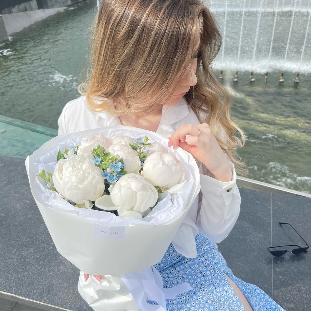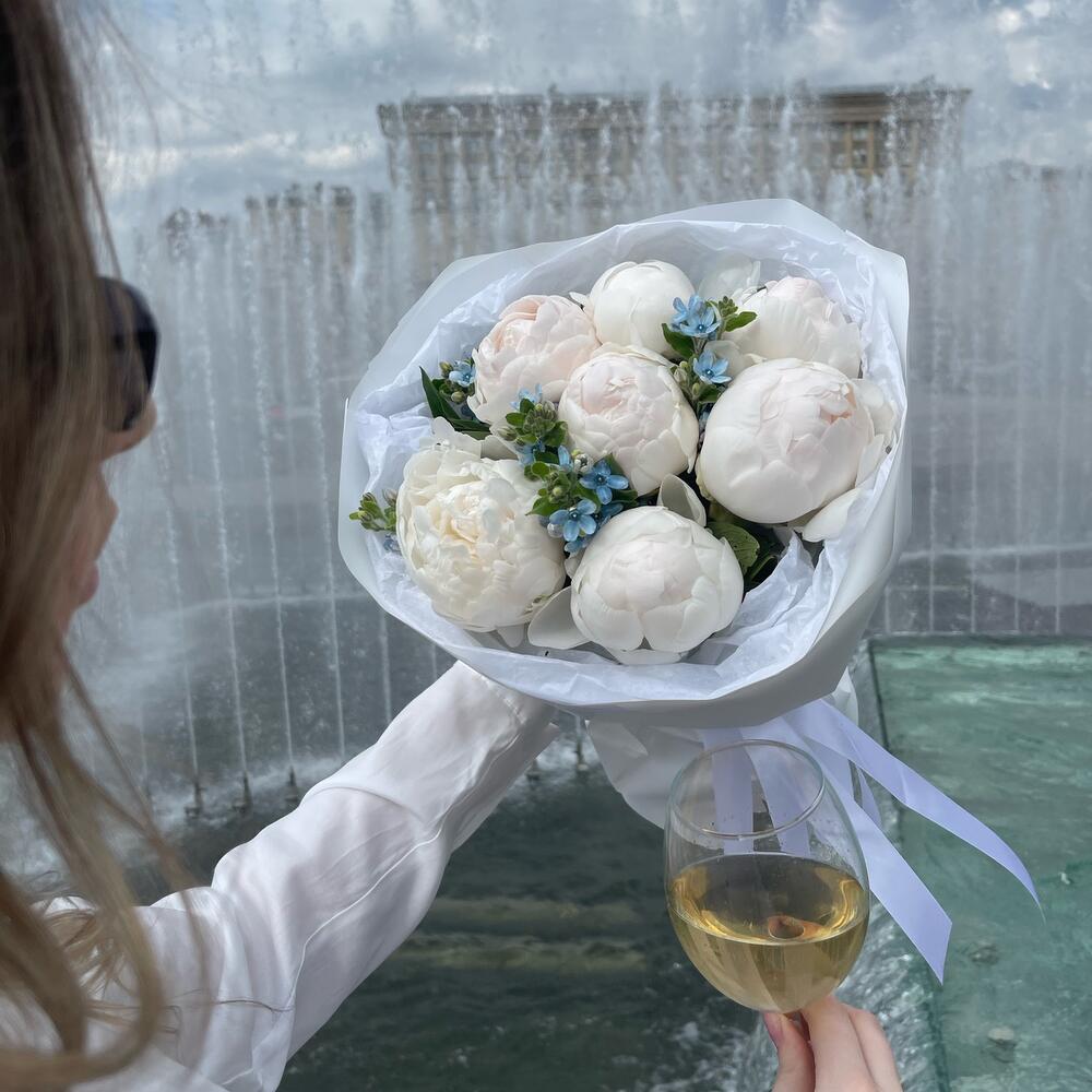 Пион белый – 7 шт.оксипеталум голубой – 3 шт.Упаковка дизайнерская – 2 шт.наклейка фирменная – 2 шт.Лента атласная – 1 шт.