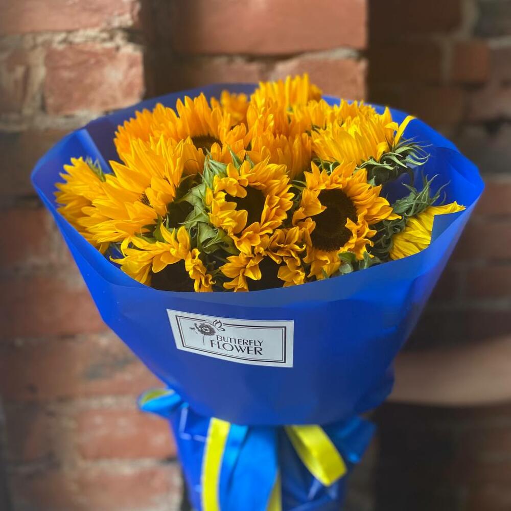 Букет из 15 подсолнухов в стильной упаковке “Пламенное солнце”