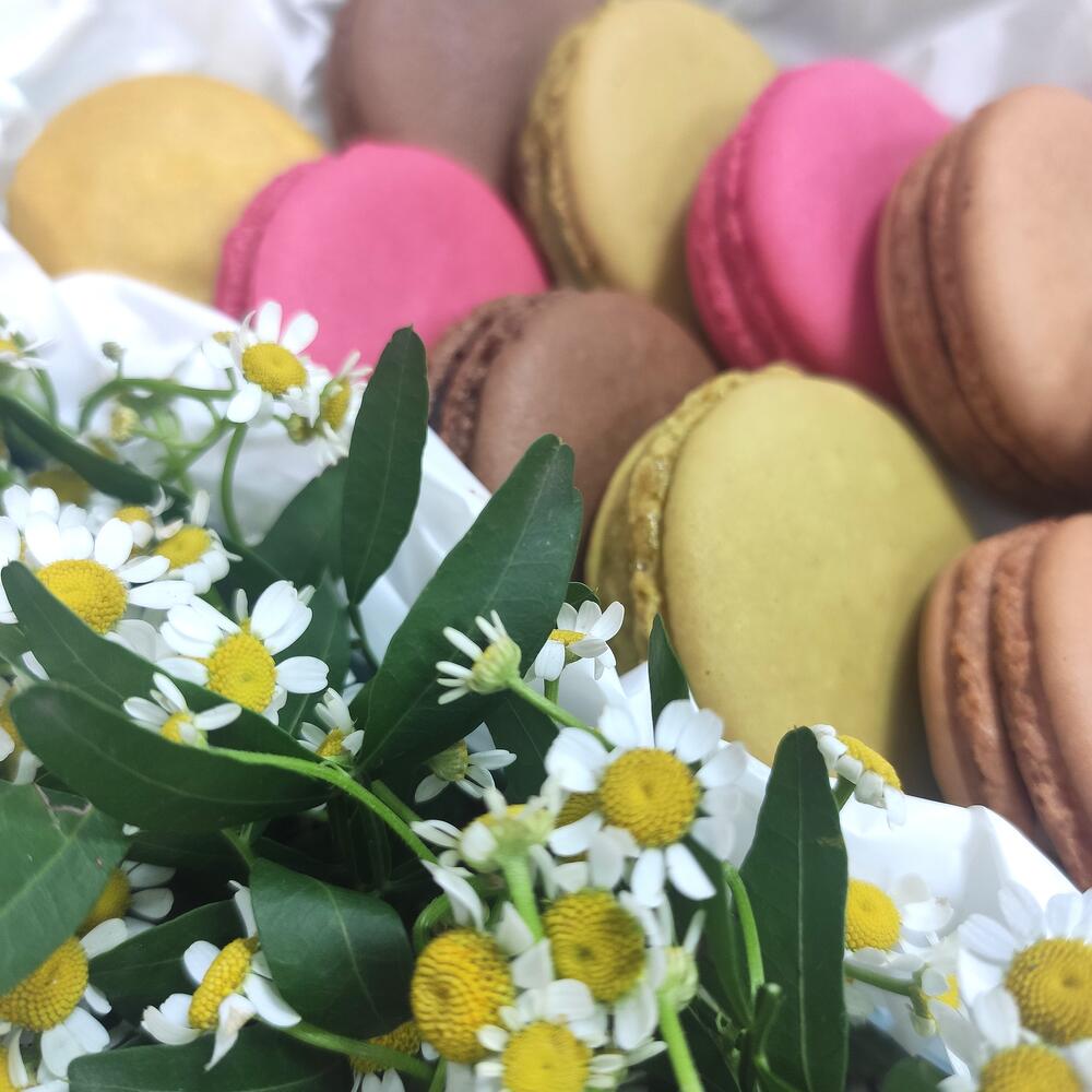 Композиция с макарунами и ромашками в коробочке