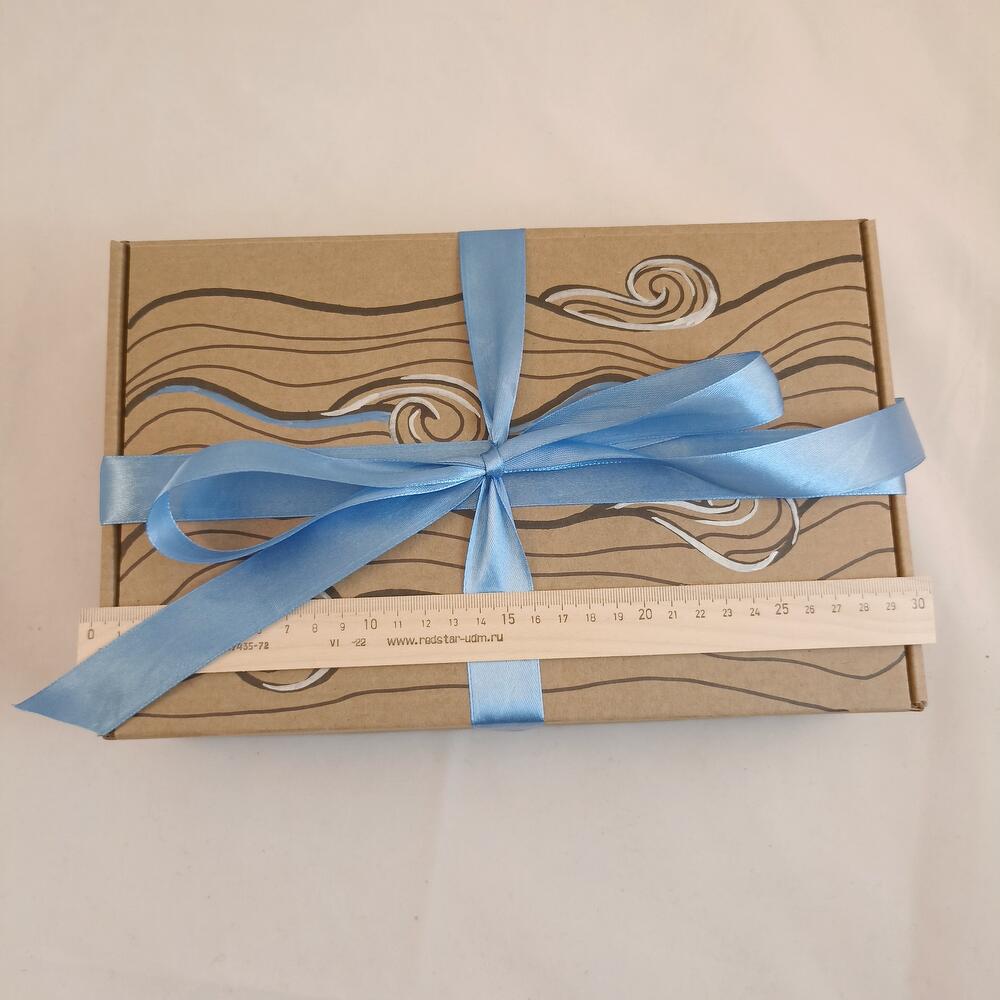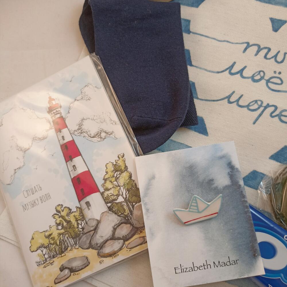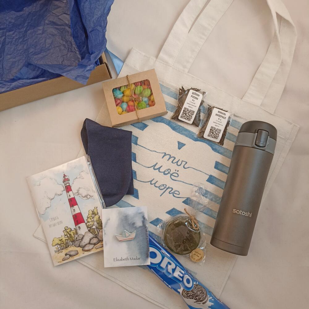 сумка шоппер – 1 шт.термос 500мл – 1 шт.морские камешки – 1 шт.Черный чай – 2 шт.мыло ромашковое – 1 шт.Орео – 1 шт.брошь керамическая ручной работы – 1 шт.носки шерстяные – 1 шт.Блокнот – 1 шт.Подарочная упаковка – 1 шт.