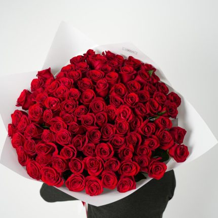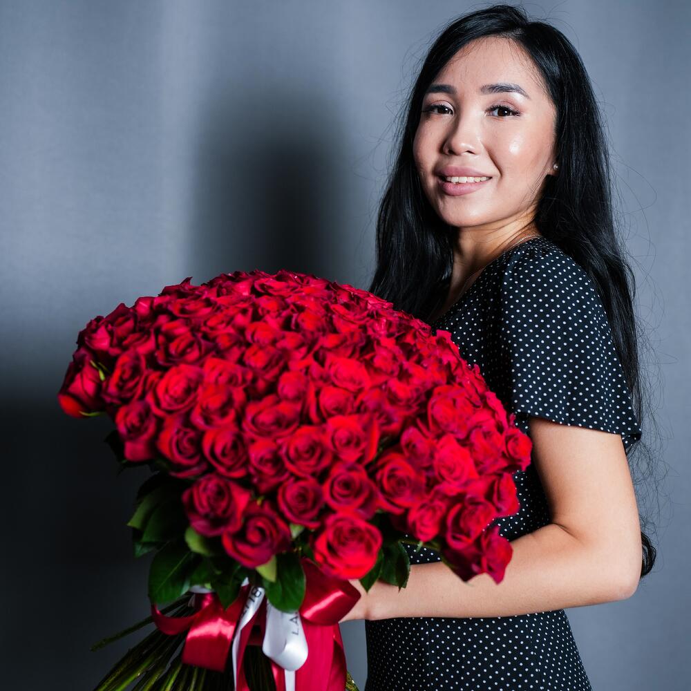 Роза – 101 шт. Лента атласная – 1 шт.