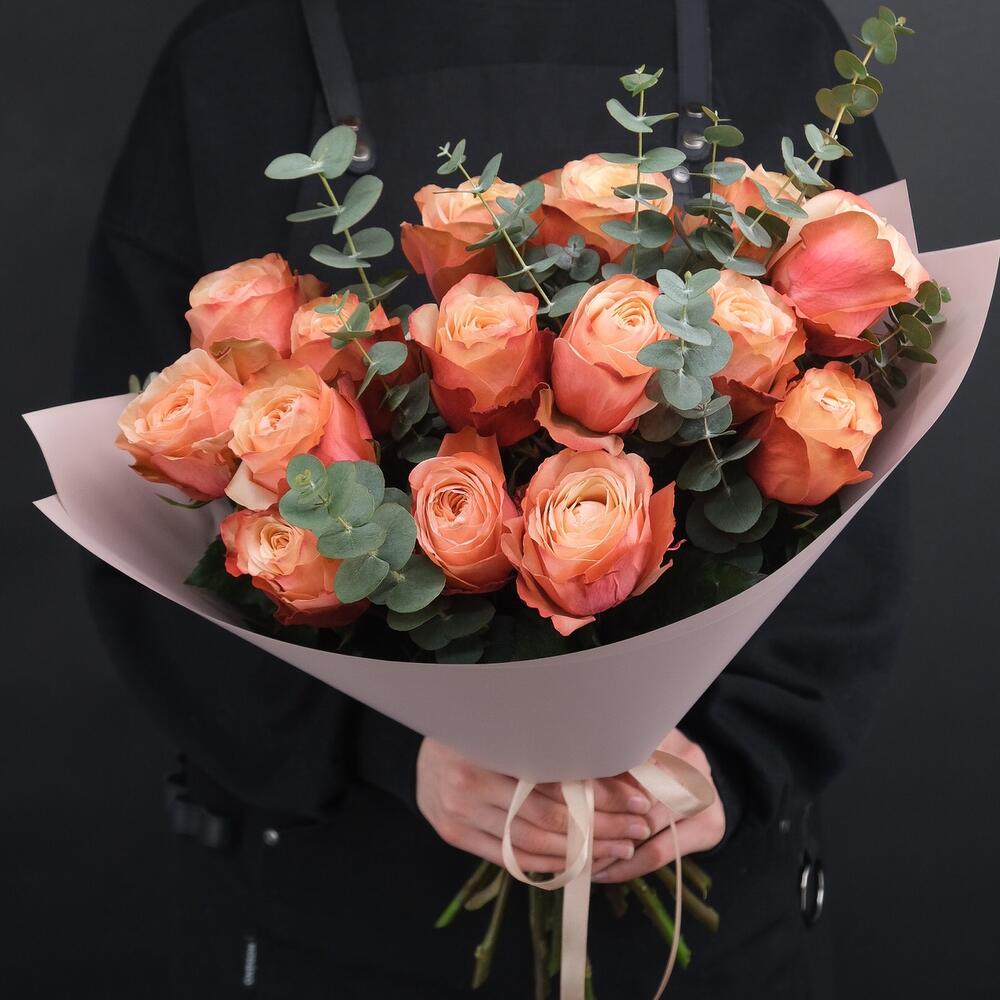 15 пионовидных роз Кахала с веточками эвкалипта