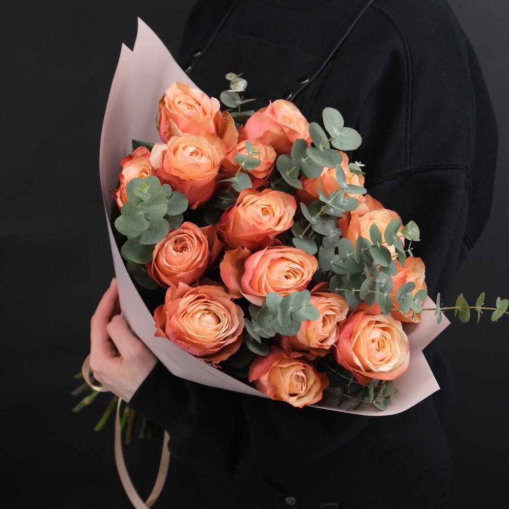 Эвкалипт – 3 шт.Роза пионовидная – 15 шт.Упаковка дизайнерская – 1 шт.Лента атласная – 1 шт.