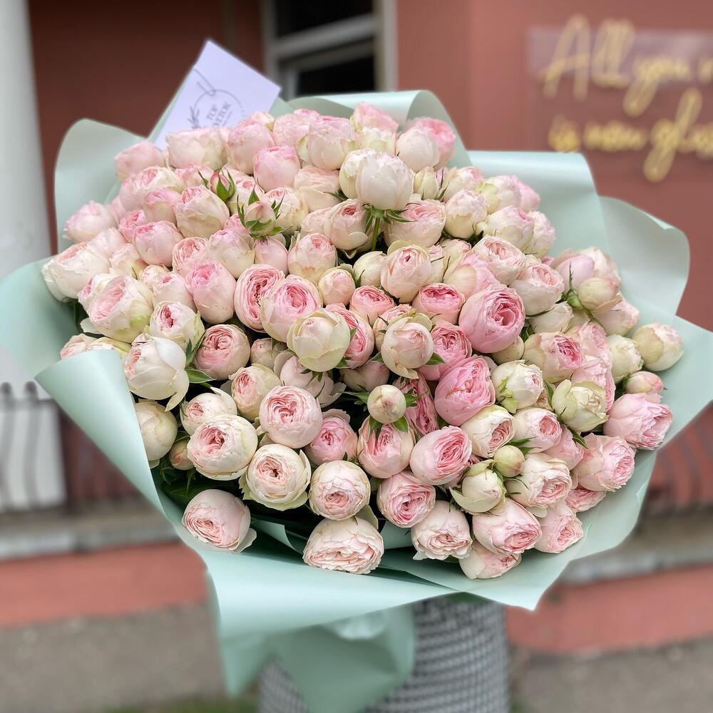 Букет из 35 кустовых пионовидных веток сорта Mansfield park в дизайнерском оформлении. Количество розочек(бутонов) может достигать 171 штучки