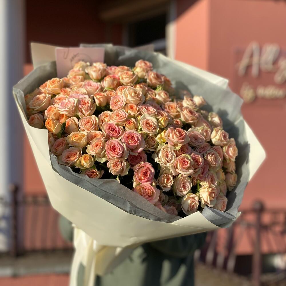 Букет из 25 кустовых веток сорта Azor с дизайнерским оформлением. Количество розочек (бутонов ) в букете может достигать 171 штуки
