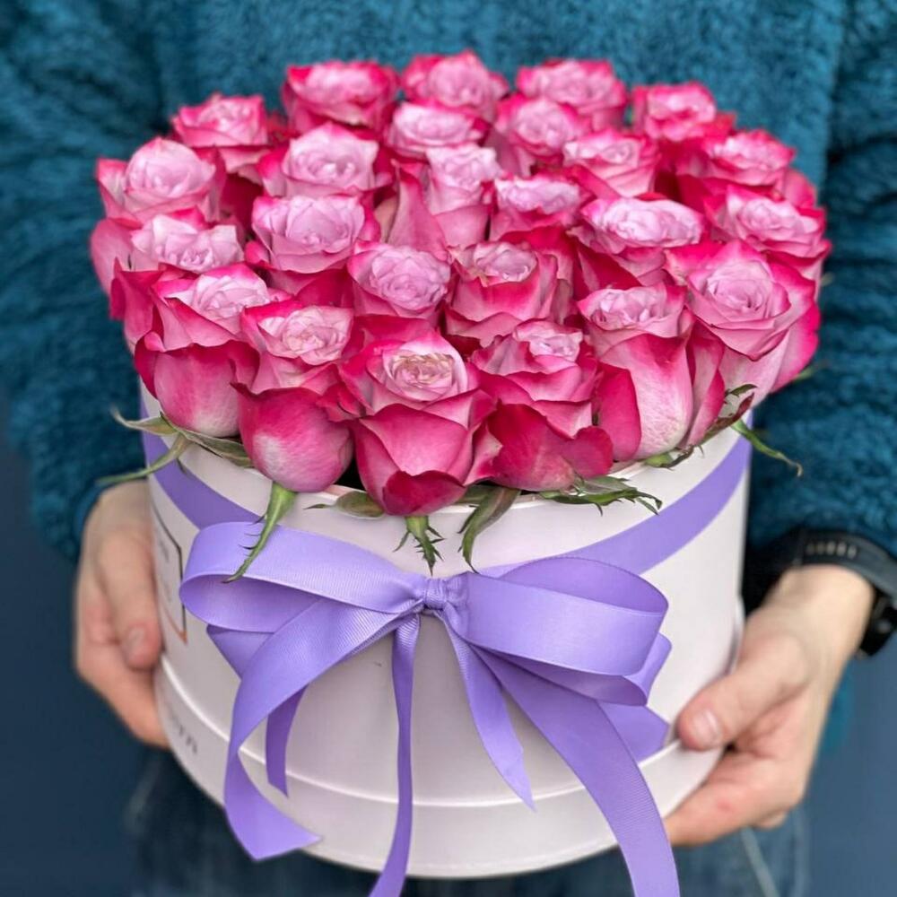 Очаровательная композиция с голландскими розами в брендовой коробке идеальный вариант подарка для ваших близких. Цвет роз можно выбрать написав нам в чат внимание, цвет коробки может отличаться