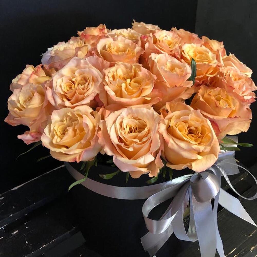 Коробка шляпная – 1 шт.Оазис флористический – 2 шт.Роза шиммер – 25 шт.
