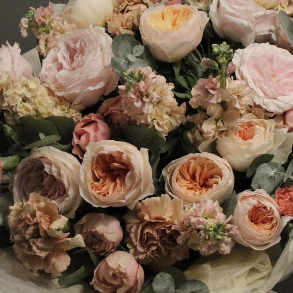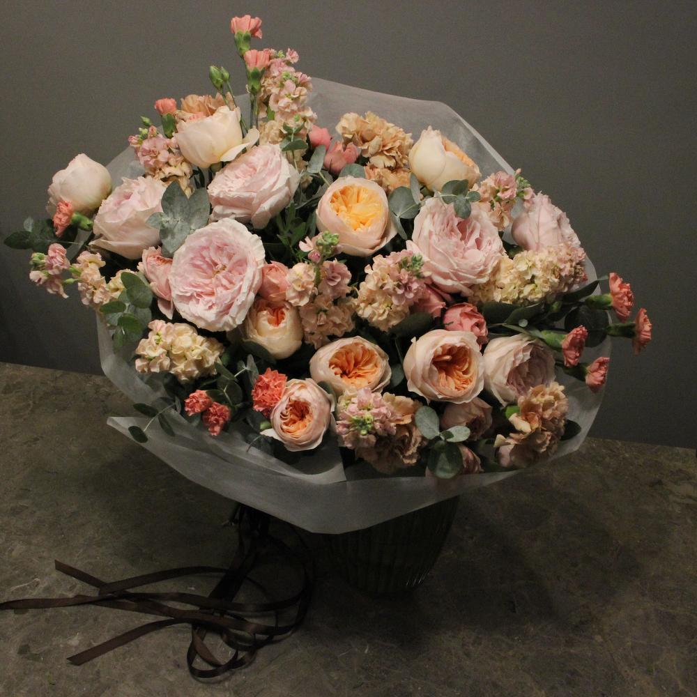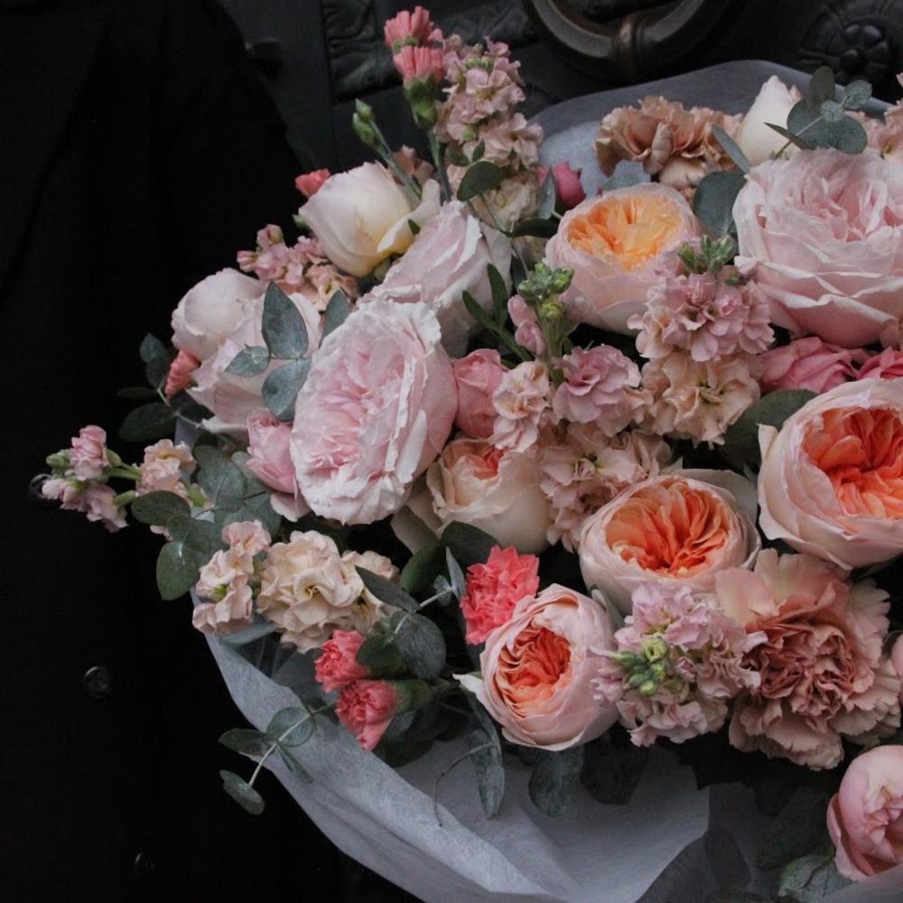 Роза пионовидная – 13 шт.Маттиола – 9 шт.Гвоздика – 7 шт.Гвоздика кустовая – 5 шт.Роза кустовая пионовидная – 3 шт.Эвкалипт – 7 шт.Бумага – 2 шт.Тишью – 3 шт.Лента атласная – 2 шт.