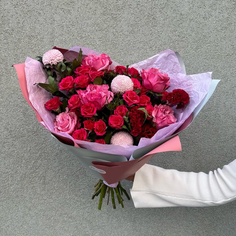 Хризантема момоко – 3 шт.роза кантри блю – 5 шт.роза квинси – 4 шт.Целозия – 2 шт.Фисташка пучок – 2 шт.Дизайнерская упаковка – 1 шт.