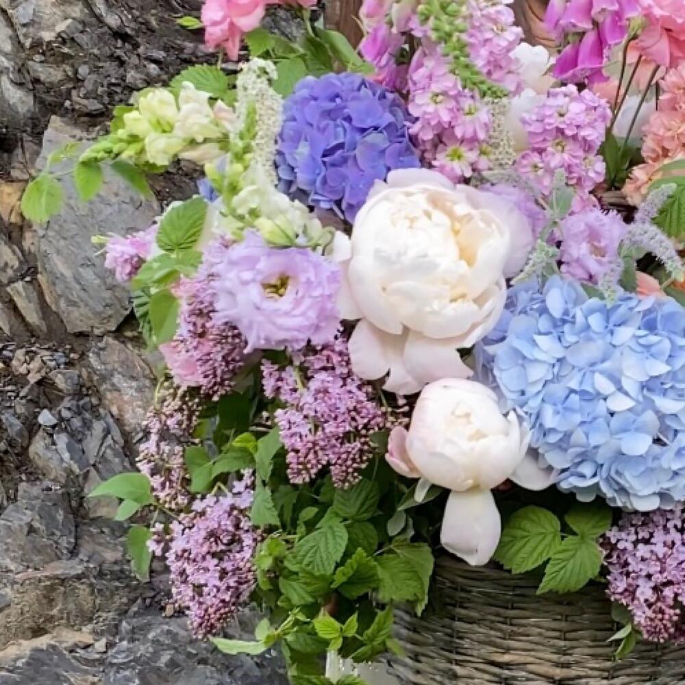 Акварельное лукошко с пионами, ранункулюсами и гортензиями