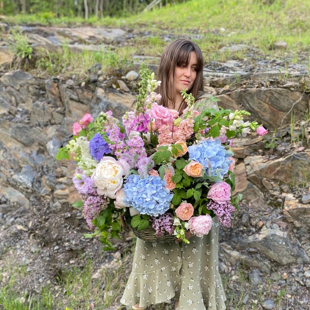 Гортензия – 5 шт.Пион – 9 шт.Роза пионовидная – 7 шт.Колокольчик – 3 шт.матиолы – 13 шт.Лизиантус – 9 шт.Наперстянка – 6 шт.Львиный зев – 7 шт.Сирень – 11 шт.Малина – 15 шт.Травы – 7 шт.Оазис флористический – 4 шт.Корзина – 1 шт.