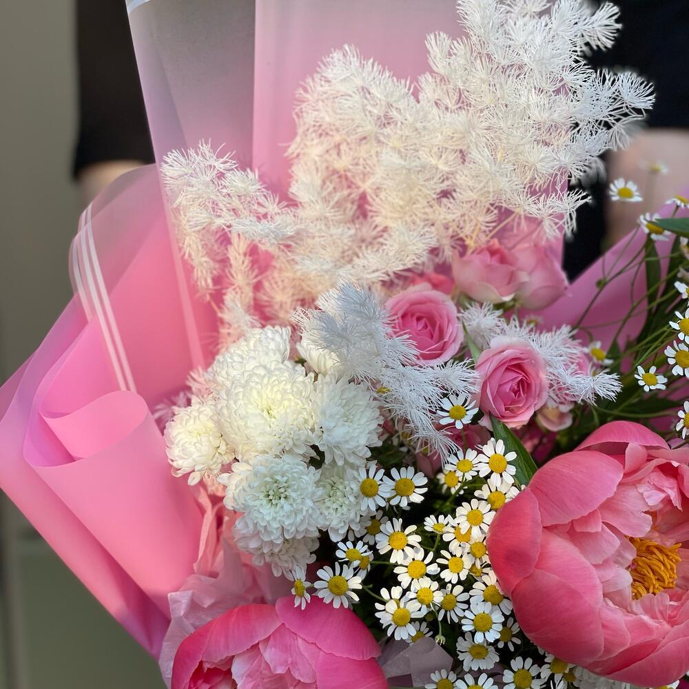 Пион – 3 шт.Хризантема кустовая – 3 шт.Кустовая роза – 2 шт.Лента атласная – 1 шт.Тишью – 1 шт.Ромашка кустовая – 5 шт.Упаковка дизайнерская – 4 шт.Аспарагус Умбелатус – 1 шт.