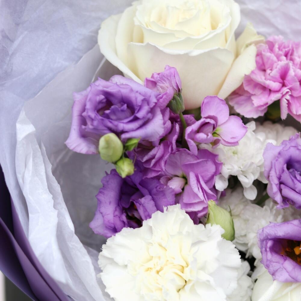 Лизиантус – 1 шт.Маттиола – 1 шт.Гвоздика – 3 шт.Сантини – 1 шт.Роза белая пионовидная – 3 шт.Открыточка с вашими пожеланиями – 1 шт.Шоколадка – 1 шт.