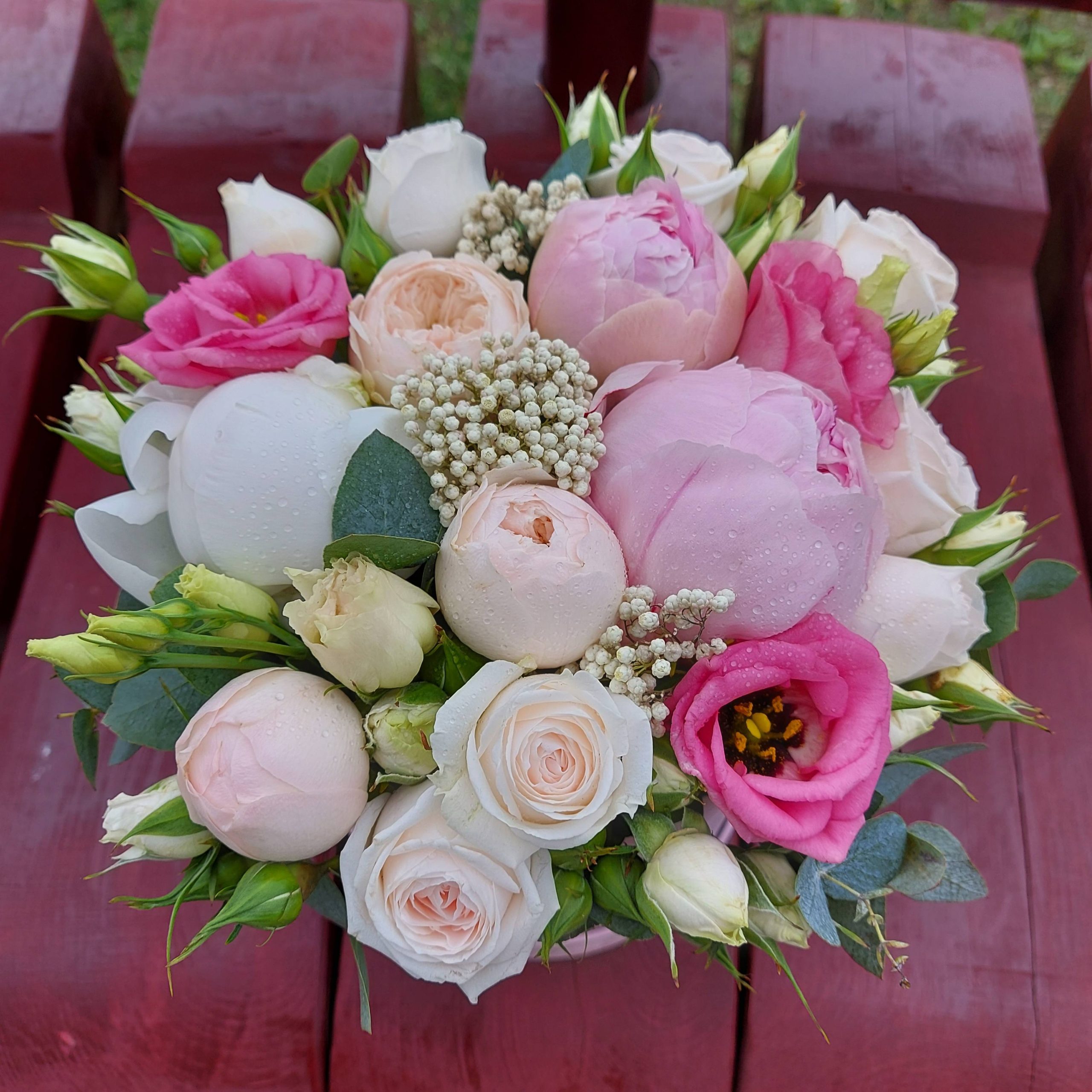 Шляпная коробочка с воздушной гипсофилой "Черничный пломбир"