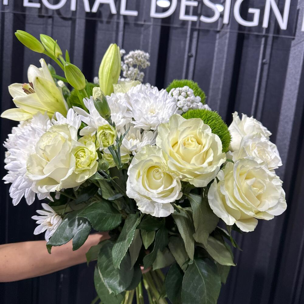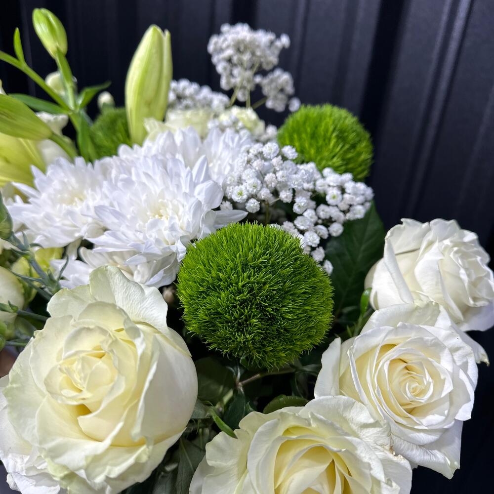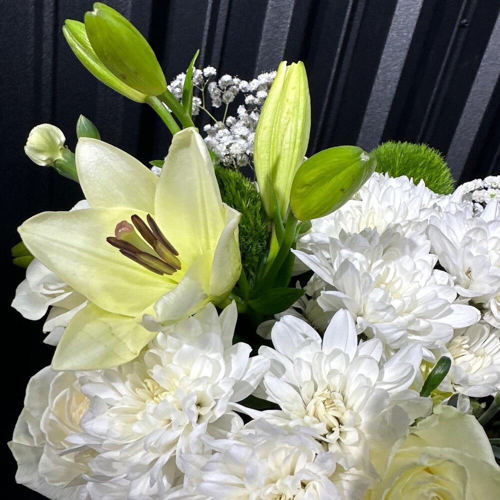 Белый авторский букет словно изящный танец света и чистоты. Изысканно переплетаясь, белые розы, каллы и лилии создают образ нежной элегантности, наполняя воздух сладким ароматом и сиянием свежести. Этот букет словно поэзия из белоснежных красок, в которой каждый цветок является чистым выражением вечной красоты.