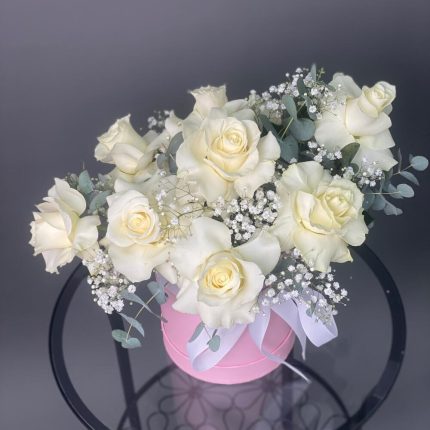 Роза кустовая – 5 шт. Хризантема кустовая – 5 шт. Эвкалипт – 5 шт. Эустома – 15 шт. розы разноцветные – 15 шт. коробка большая шляпная – 1 шт.