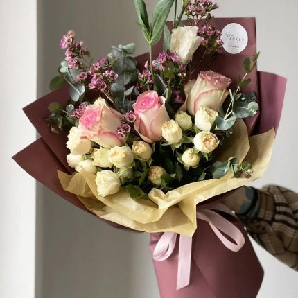 Роза – 3 шт. Спрей роза – 3 шт. Лизиантус – 3 шт. Хризантема – 2 шт. Сантини – 2 шт.