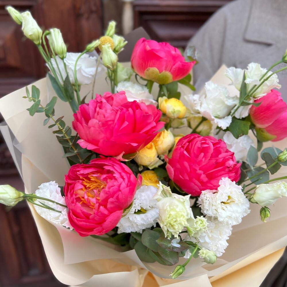 Краспедия – 1 шт.Эвкалипт – 3 шт.Лента атласная – 2 шт.Пленка матовая – 7 шт.Эустома белая махровая – 4 шт.Пион коралл шарм – 5 шт.роза пионовидная луна трендсеттер – 1 шт.