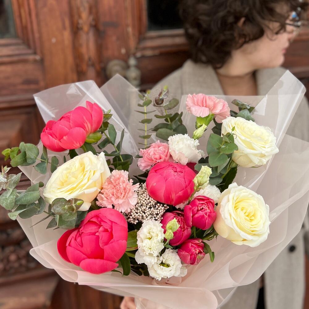 Категорий: Гвоздики, Лизиантусы, Пионовидные розы, Розы, Тюльпаны