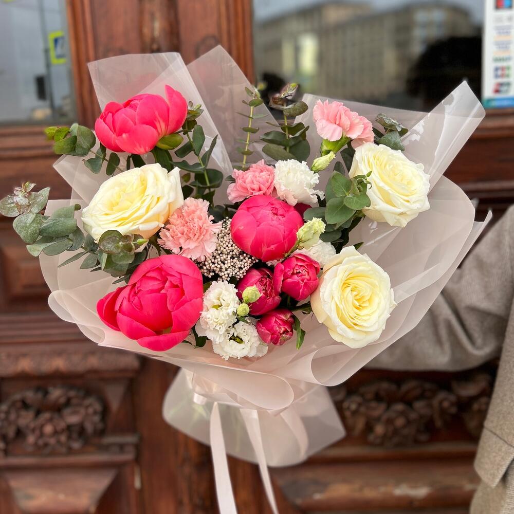 Озотамнус – 1 шт.Эвкалипт – 4 шт.Лента атласная – 2 шт.Диантус – 3 шт.Тюльпан пионовидный – 3 шт.Пленка матовая – 7 шт.эустома махровая белая – 1 шт.Пион коралл шарм – 3 шт.роза кэндллайт – 3 шт.