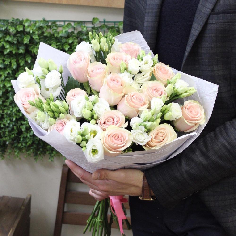 Лизиантус – 10 шт.Лента атласная – 2 шт.Крафт дизайнерский – 2 шт.роза фруттето – 15 шт.