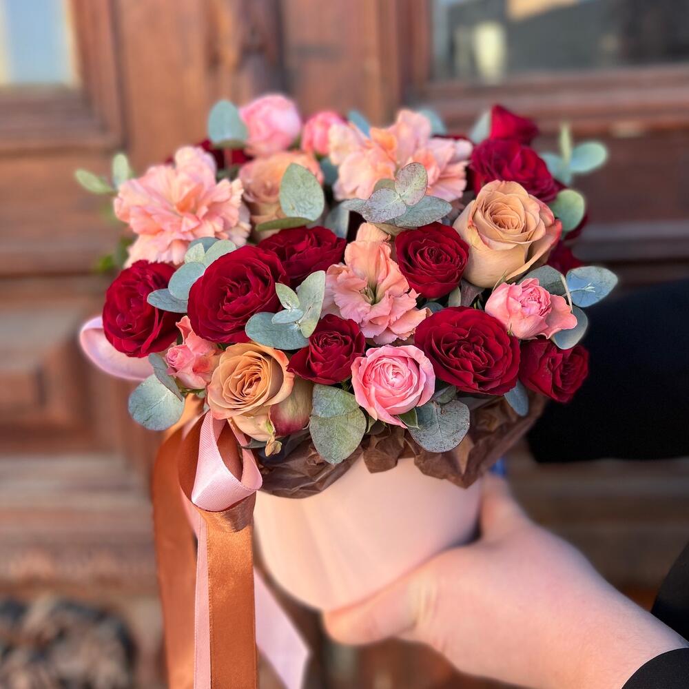 Роза Капучино – 3 шт.Эвкалипт – 3 шт.Лента атласная – 2 шт.Диантус – 3 шт.Коробка шляпная – 1 шт.Оазис флористический – 1 шт.роза кустовая мадам бомбастик – 1 шт.роза кустовая пионовидная ред трендсеттер – 2 шт.