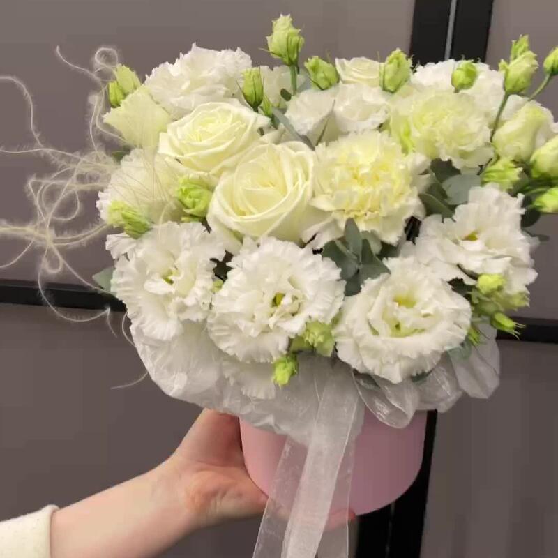 роза пионовидная плайя бланка – 3 шт.эустома махровая белая – 3 шт.Диантус – 3 шт.Эвкалипт – 2 шт.Оазис флористический – 1 шт.Коробка шляпная – 1 шт.Лента атласная – 2 шт.Тишью – 1 шт.Ковыль – 1 шт.