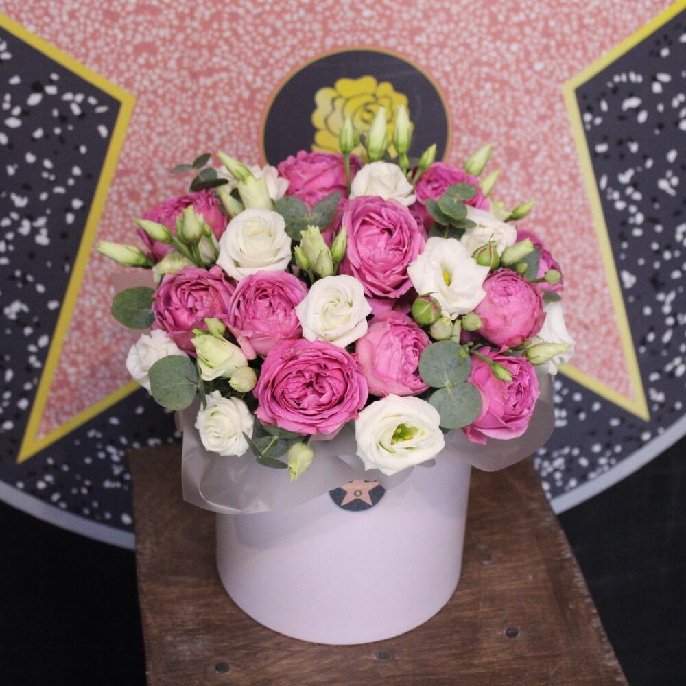 Эвкалипт – 2 шт.Шляпная коробка – 1 шт.Оазис флористический – 1 шт.эустома белая – 3 шт.Пленка дизайнерская – 1 шт.роза кустовая пионовидная misty bubbles – 4 шт.