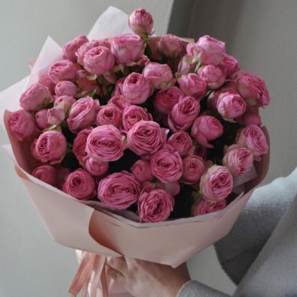 Букет упакован в корейскую пленку и перевязан атласной лентой.