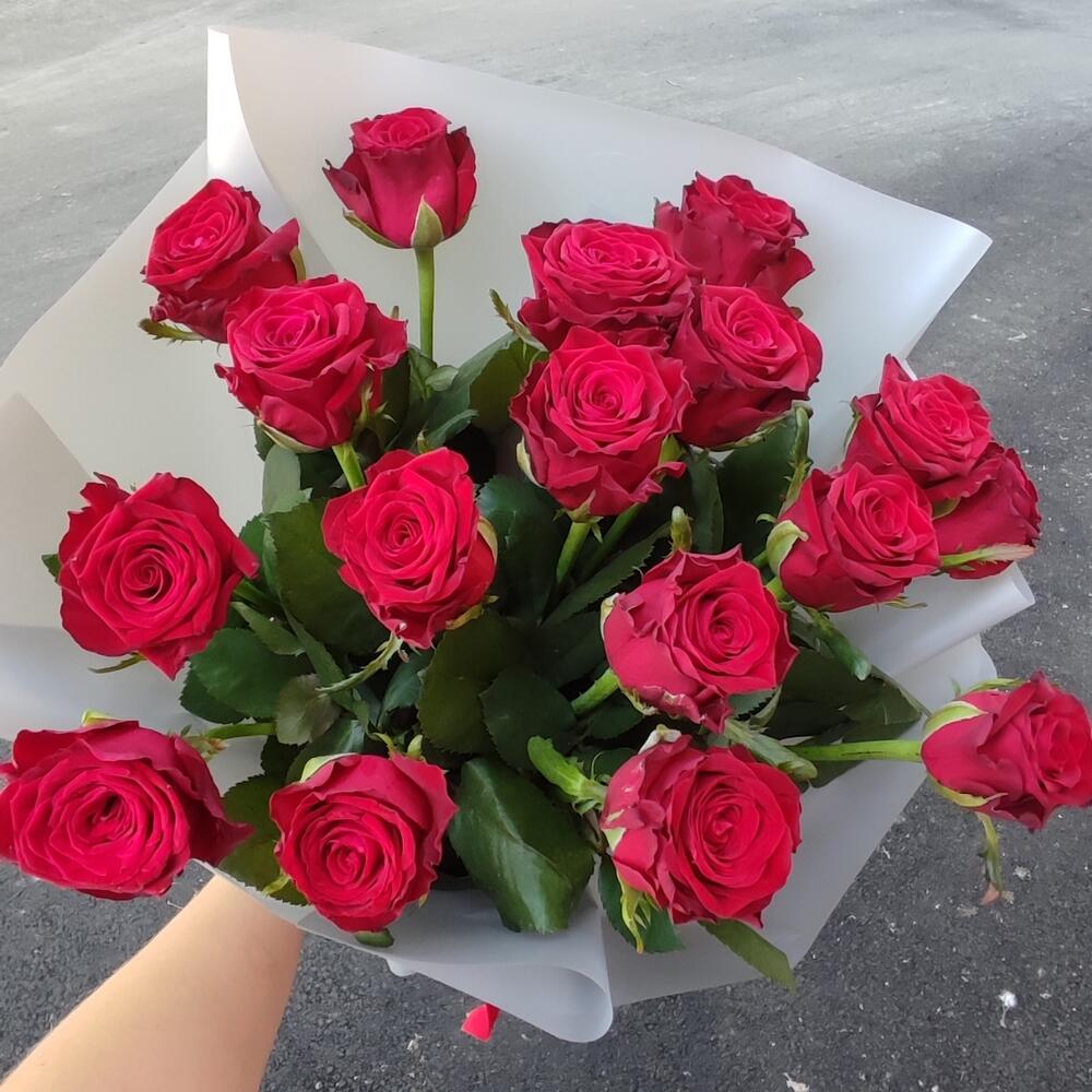 Роза украинская – 17 шт. Упаковка калька флористическая – 1 шт.