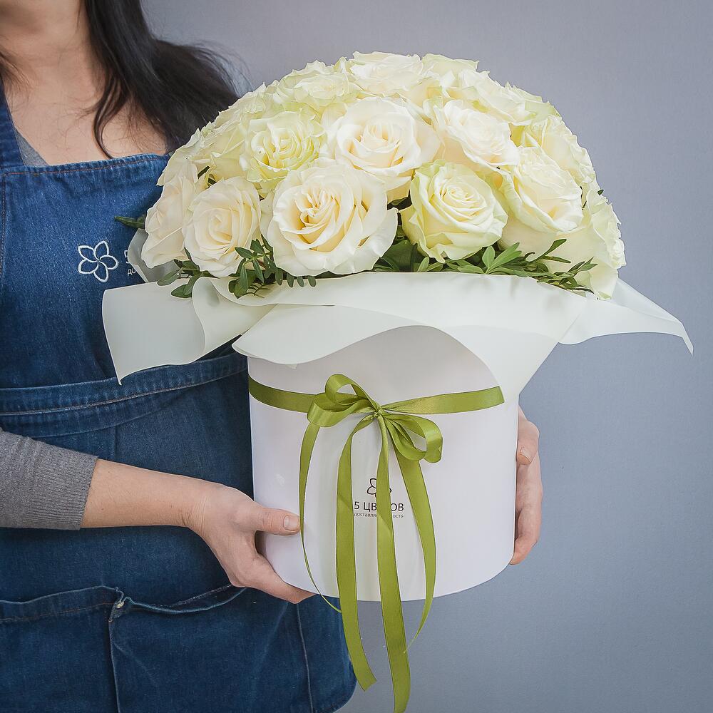Букет 25 белых роз в шляпной коробке