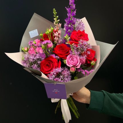 Роза Эквадор – 3 шт. Луковичные растения – 3 шт. Пионовидная кустовая роза – 1 шт. Лимониум – 2 шт. Упаковка дизайнерская – 2 шт. Открыточка с вашими пожеланиями – 1 шт. инструкция по уходу за цветами – 1 шт.