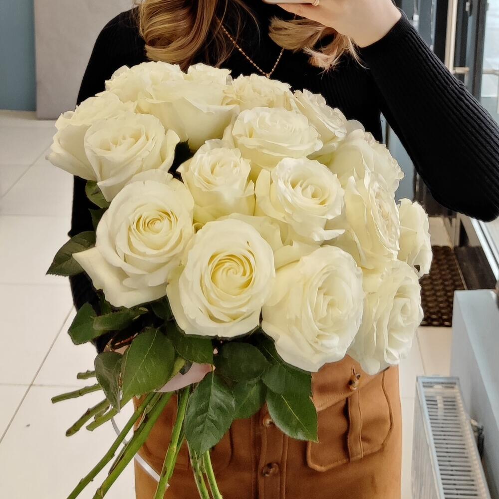 Букет белых роз и лизиантуса с Эвкалиптом «Мята»