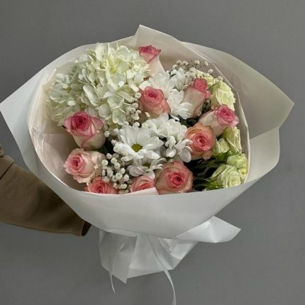 Гортензия – 3 шт. Хризантема одноголовая – 6 шт. Роза – 2 шт. Вибурнум – 4 шт. Гвоздика – 1 шт.