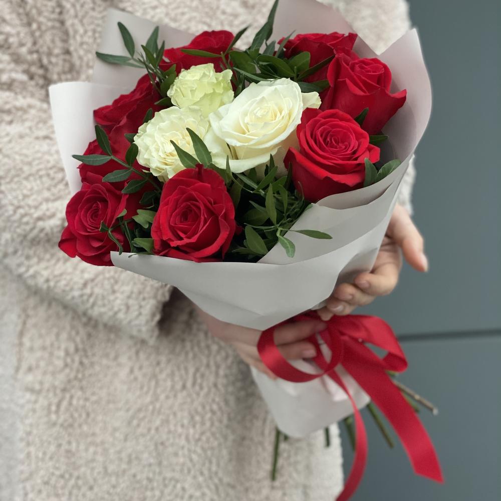 Роза белая – 3 шт. Роза красная – 8 шт. Оформление – 1 шт. Писташ – 5 шт.