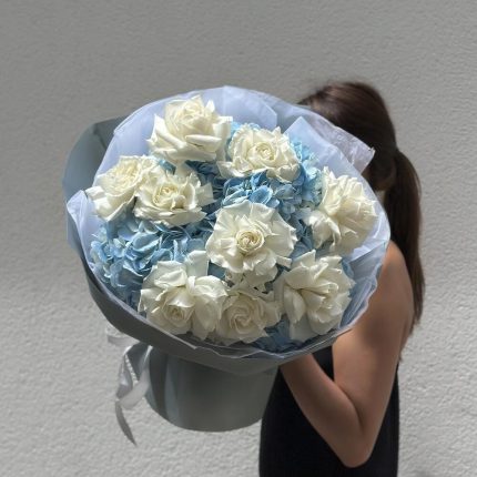 Кремово-клубничая композиция из нежнейших роз и гортензии.