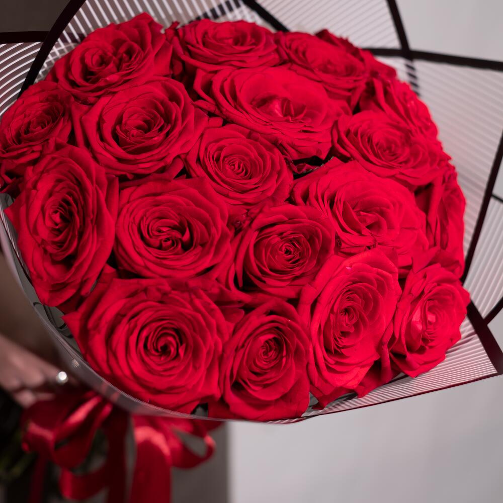 Лента атласная – 2 шт.Красная роза – 19 шт.Дизайнерская упаковка – 2 шт.подкормка для срезанных цветов – 1 шт.инструкция по уходу за цветами – 1 шт.любовь флориста (бесплатно) – 1 шт.