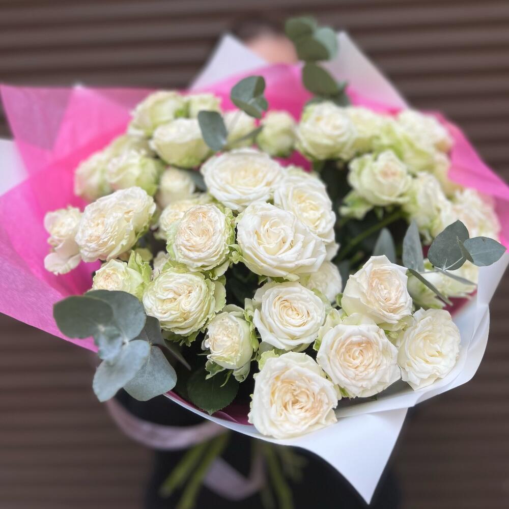 бомбастик белая – 9 шт.Эвкалипт – 5 шт.Тишью – 1 шт.Пленка матовая – 2 шт.лента атлсная – 1 шт.