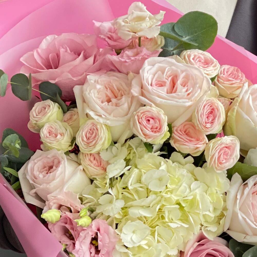Альстромерии, Гортензии, Кустовые розы, Лизиантусы, Розы, Хризантемы