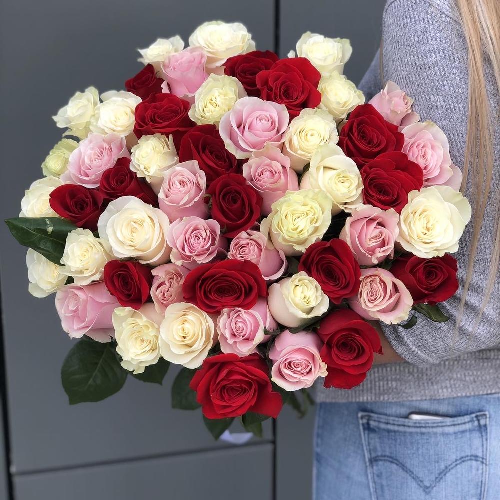 Букет из красных, белых и розовых роз Бабочки внутри меня из 51 розы